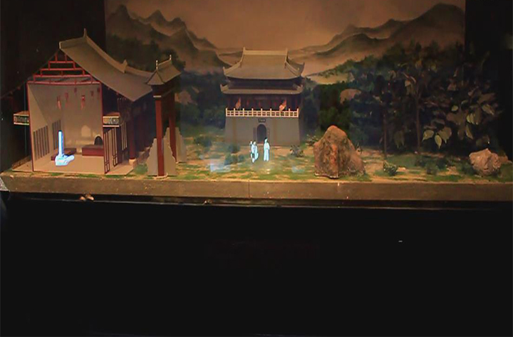 幻影成像是利用45度光學反射原理實現懸空立體效果,將所拍攝的影像投射到布景箱中的主體模型景觀中,實現實景造型與幻像的結合,從而完美演繹故事發展過程。除此之外,還可以配上三維聲音、燈光、氣味、煙霧等,使其展示效果更加惟妙惟肖。
