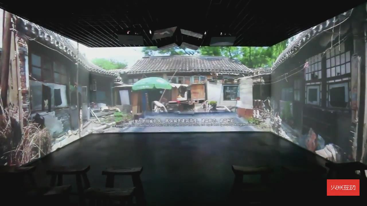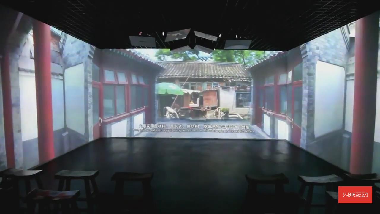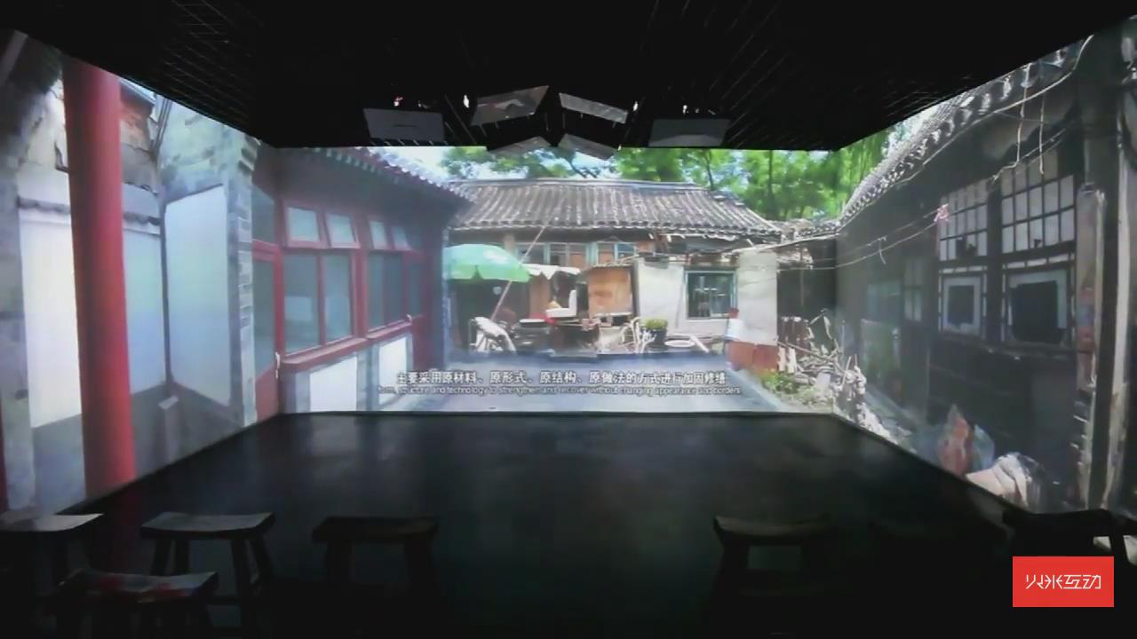 通過沉浸式三折幕投影展示了北京四合院的古都風貌,再配上立體聲效,能夠有強力的視聽沖擊感。