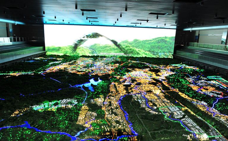 在空間、信息和觸控三屏的聯(lián)動(dòng)下的沙盤。由空間屏的三維場(chǎng)景,準(zhǔn)確的把現(xiàn)實(shí)世界里的所有展現(xiàn)出來,例如可以任意的查詢地理信息、任意的去調(diào)整角度進(jìn)行瀏覽、根據(jù)需要來添加備注等。